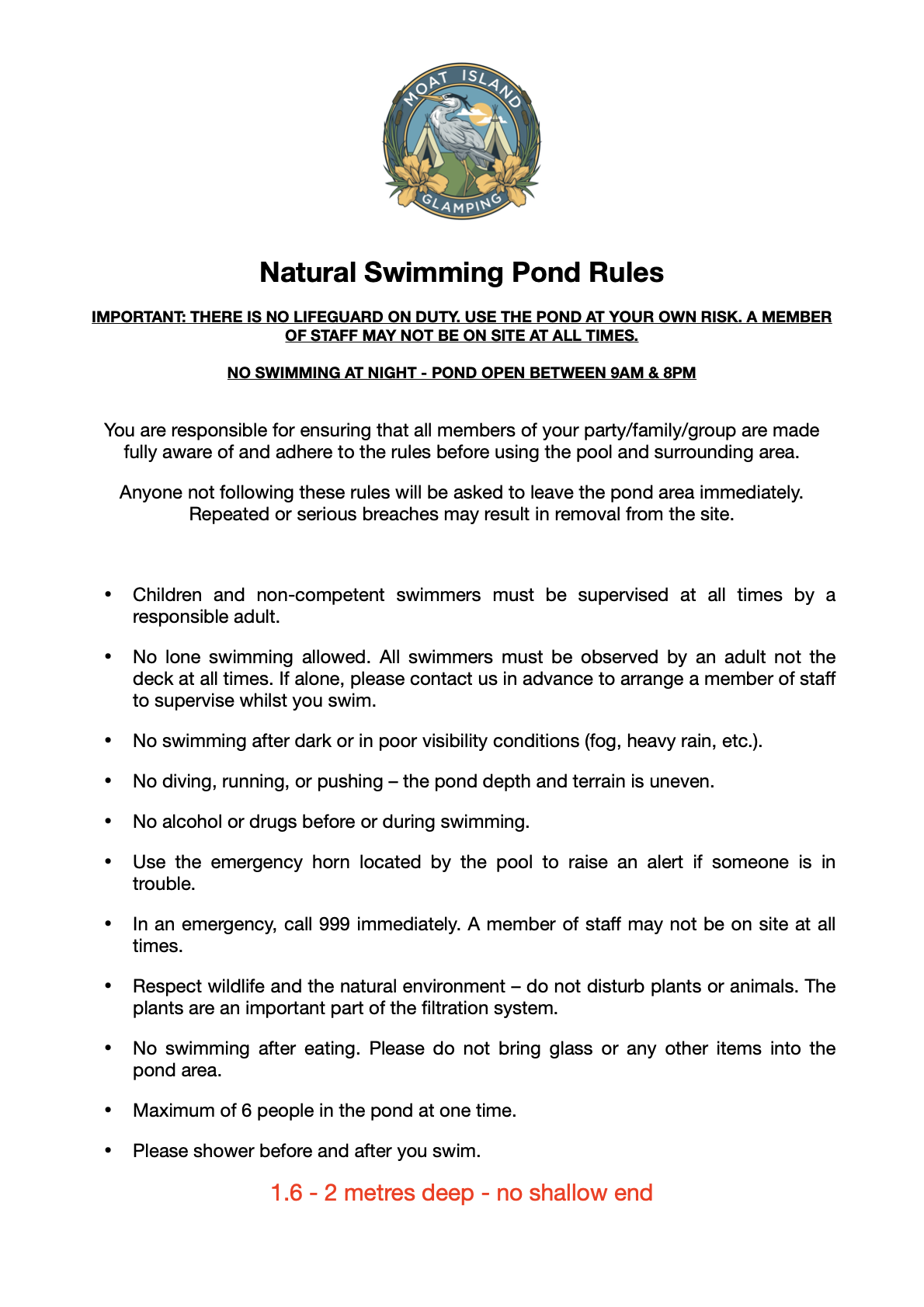 There is no need to book swimming if you are staying at Moat Island!